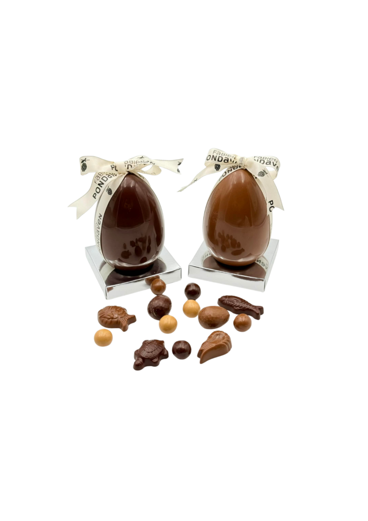 Oeufs pralinés : Sucre, Beurre de cacao, Poudre de lait écrémé, Pâte de cacao, Lactosérum en poudre (lait), Matière grasse laitière, Poudre de lait entier, Emulsifiant: lécithine de soja sans OGM, Arôme naturel de vanille, Arôme, Amande, Noisette, Fleur de sel, Poudre de lait 0%.